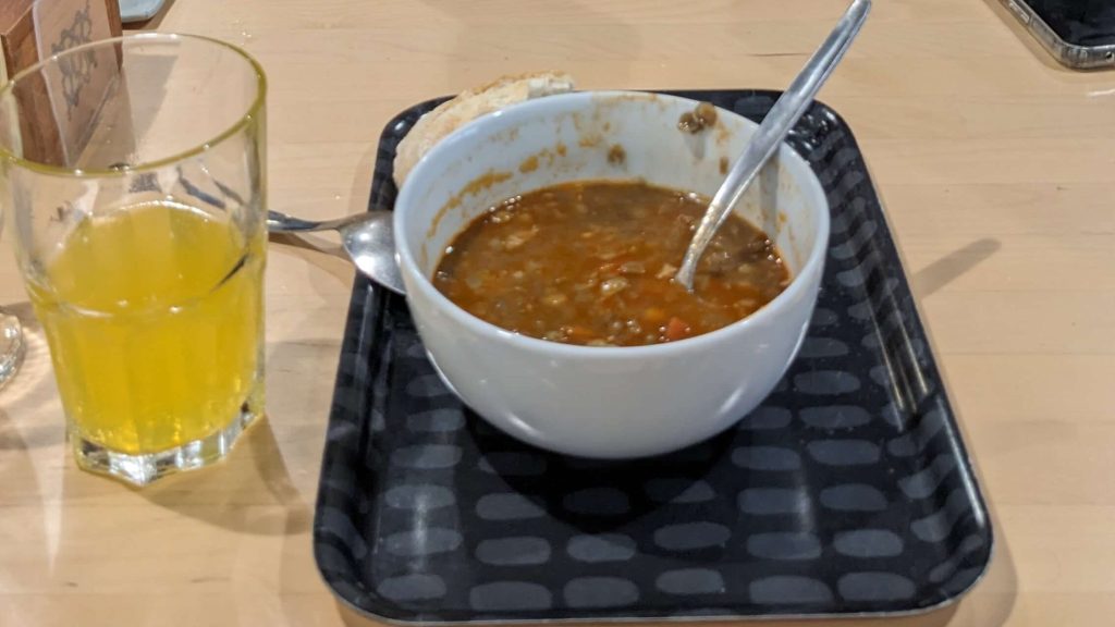 Por volta das nove da manhã, paramos num bar em Valga chamado Buen Camino. Ao descobrir que têm sopa de lentilhas, o meu corpo reage com a certeza de que é exatamente o que eu preciso. Sorvo a sopa até à última gota e pela primeira vez, desde que me levantei, sinto-me bem, tenho os pés na terra e estou centrado no meu eixo. Faço questão de ir agradecer à dona do bar pela sua inesperada decisão de oferecer sopa de lentilhas logo pela manhã. Foi uma das muitas dádivas que recebi do caminho. A maior parte delas tão simples como uma sopa de lentilhas.