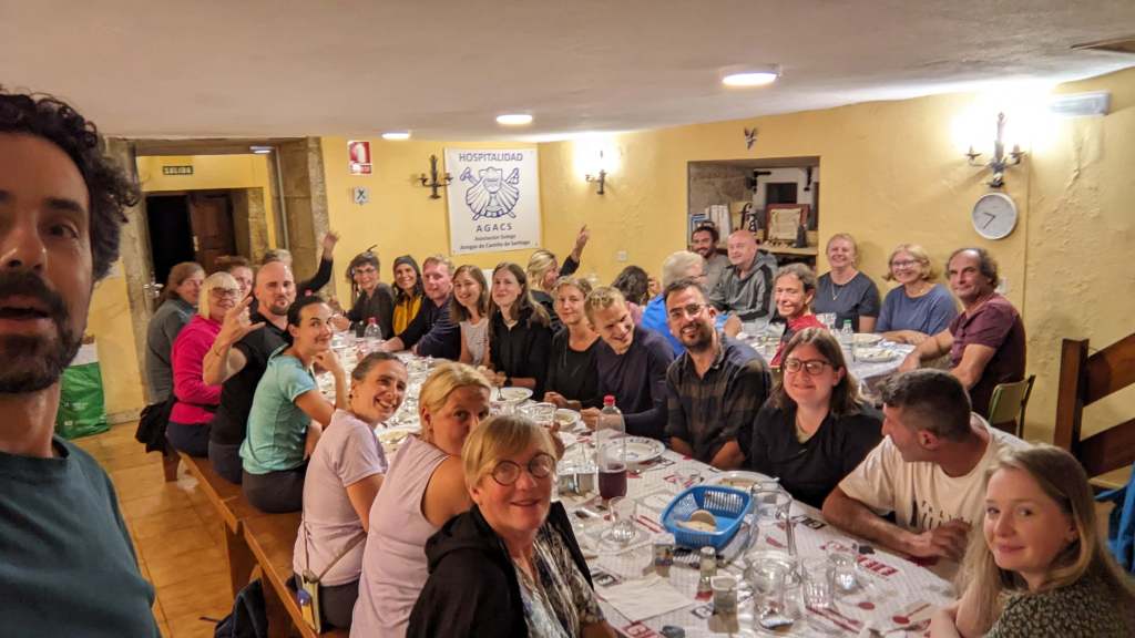 As portas abrem-se e somos distribuídos pelas antigas celas dos alunos que estudavam no mosteiro. São pequenos cubículos onde cabem beliches para duas pessoas. Há pessoas que não conseguem lugar e isso cria alguma tensão no voluntário que nos está a receber. Percebo que ele está a precisar de falar e junto-me a ele a beber uma cerveja preta 1906 na cozinha. Chama-se Juan e está ali durante quinze dias como voluntário. É ele que prepara as camas, que recebe as pessoas, que faz o jantar e o pequeno-almoço. Faz tudo sozinho. Diz que quer dar aos peregrinos tanto como recebeu dos muitos caminhos que fez. Em tom confidente, explica-me que todos começamos a vida com dois copos, um vazio de experiência e outro cheio de sorte. O segredo é ser capaz de encher o copo da experiência, sem esvaziar o da sorte.
